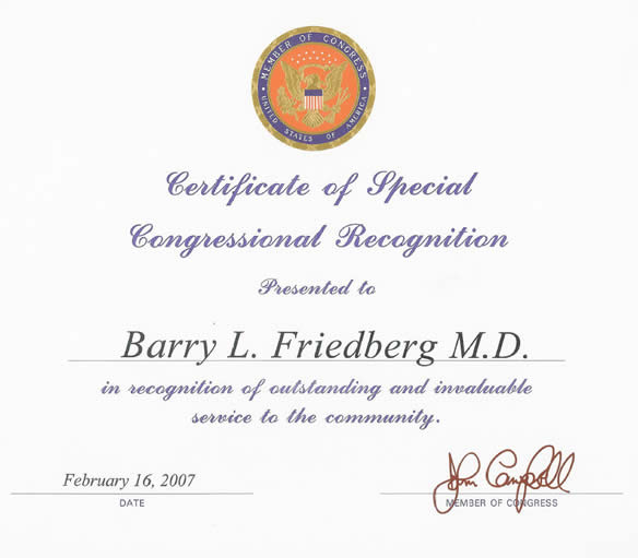 Congressional award is given to Dr. Barry Friedberg for his contribution to military anesthesia in Iraq and Afghanistan, sparing the need for anesthesia machines in the field hospitals as well as the logistical difficulties involved in supplying large quantities of oxygen to run the machines,